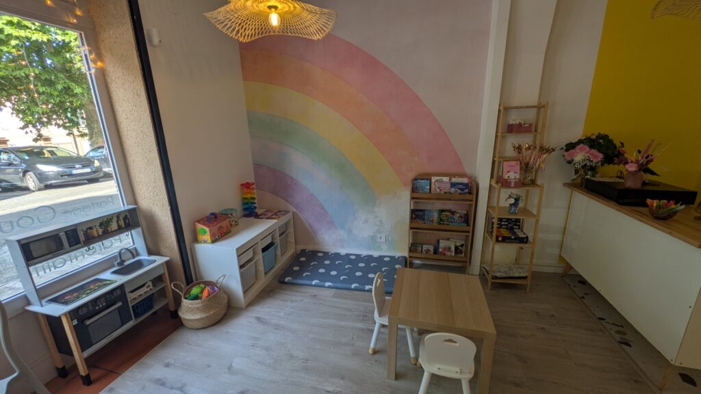 Le salon de thé propose un espace jeu spécialement conçu pour les enfants, avec un tapis à dessiner, une dinette, des puzzles, des poupées, des activités de coloriage et une sélection de livres adaptés. Cet espace ludique permet aux enfants de s’amuser pendant que les parents se détendent.